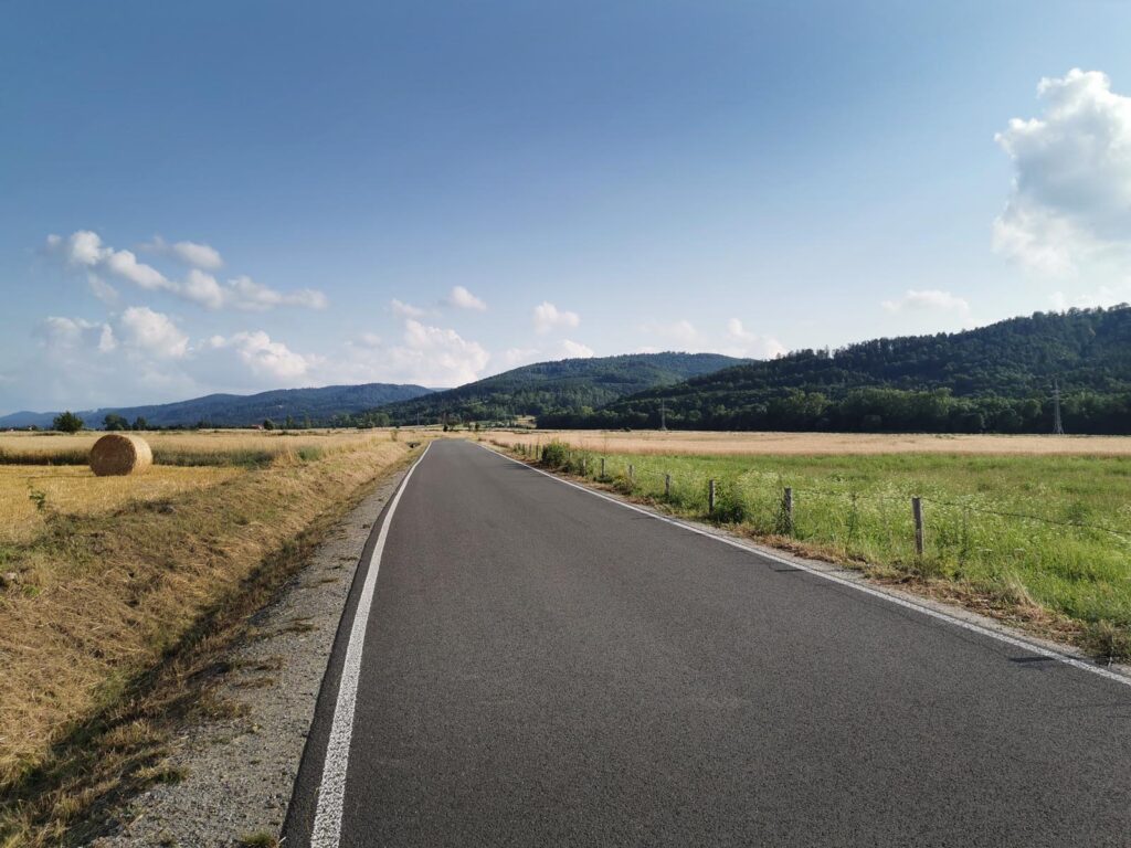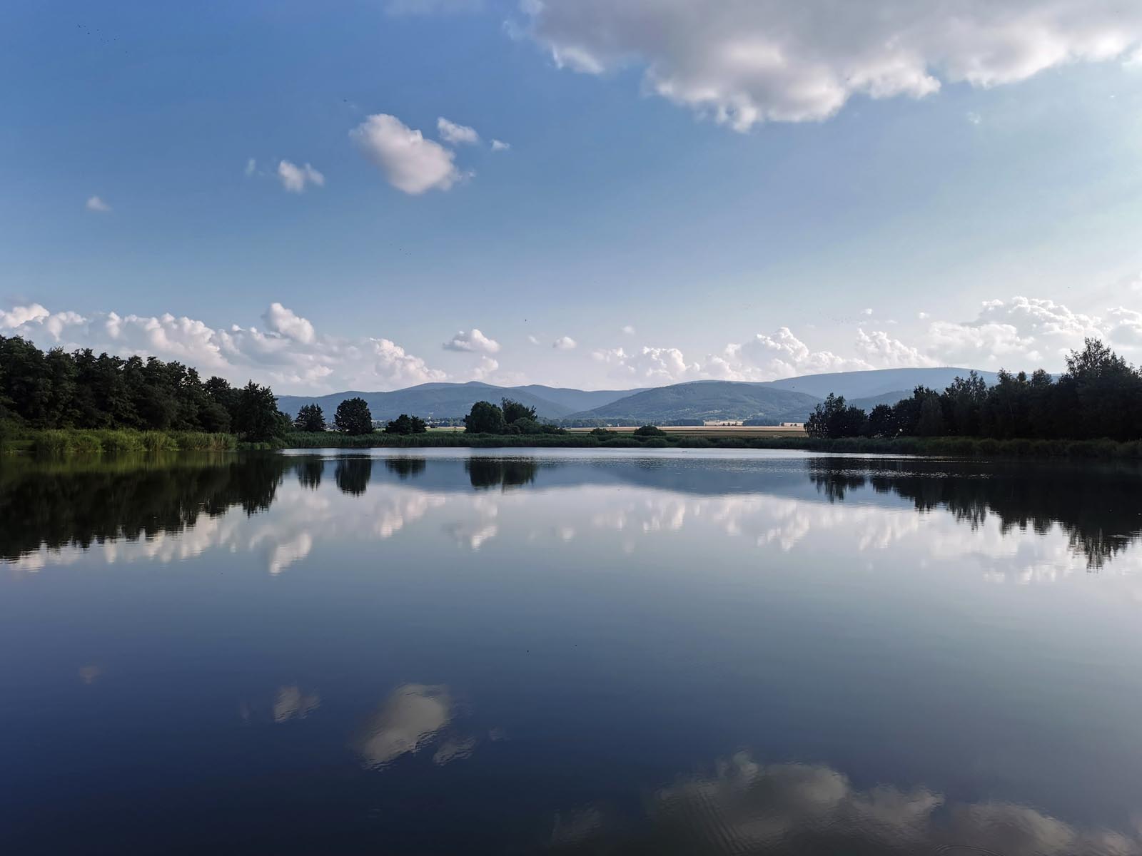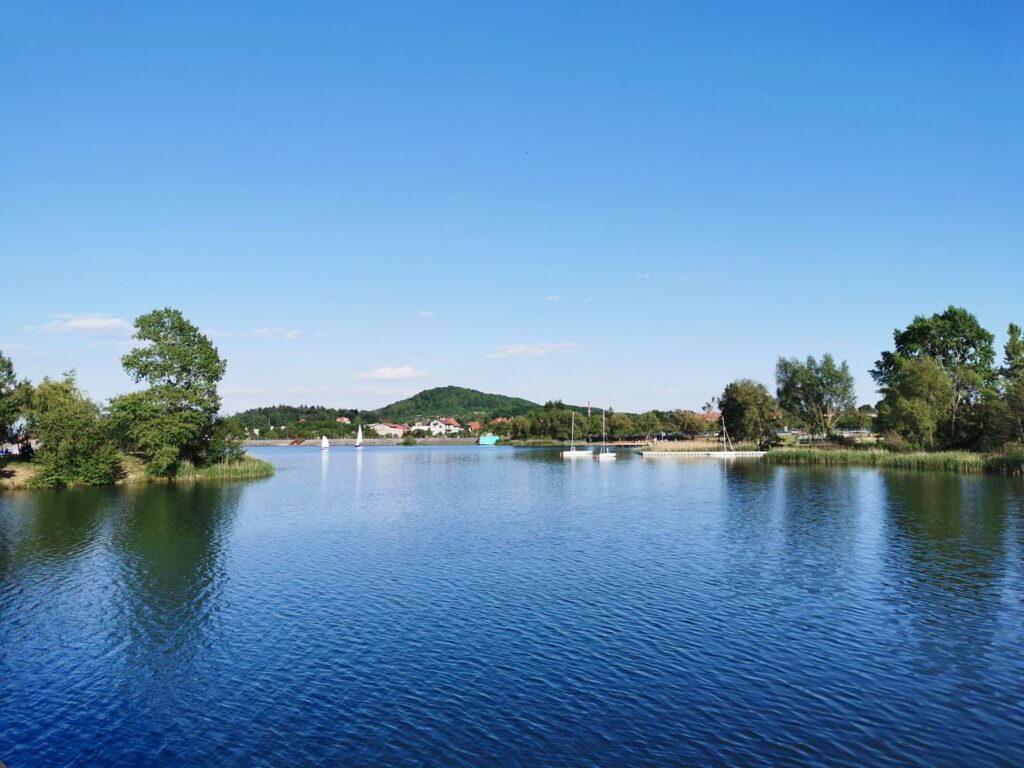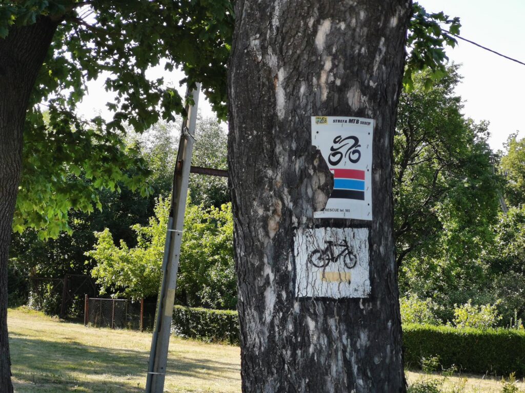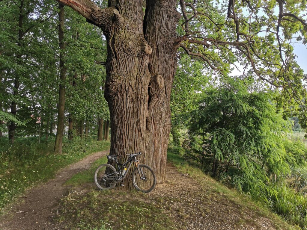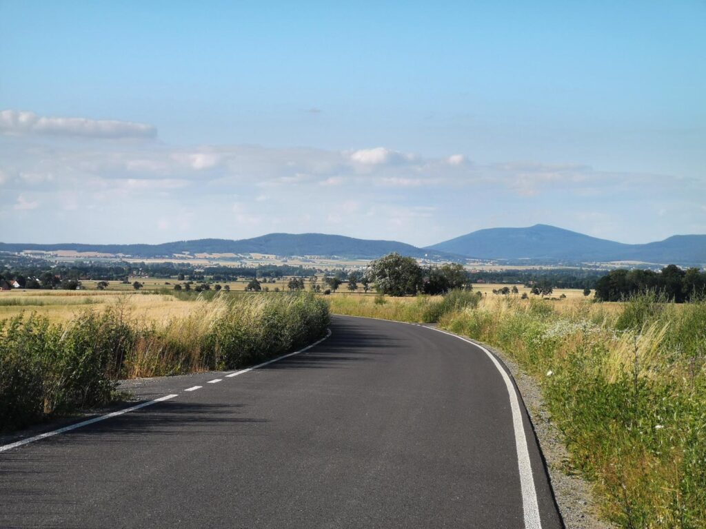 To część asfaltowa. Droga jest nowiutka, gładka i lekko w dół. Towarzyszą nam Góry Sowie, widoczne po lewej ręce. Przed sobą widzimy zaś Wzgórza Kiełczyńskie oraz Masyw Ślęży i Raduni. Czego można chcieć więcej? No tak, jeszcze jakieś jeziorko czy staw by się przydał! Ta zachcianka zostaje zaspokojona w Bratoszowie, gdzie pod wielkim dębem szypułkowym, można sobie spocząć i refleksyjnie podziwiać okoliczności.