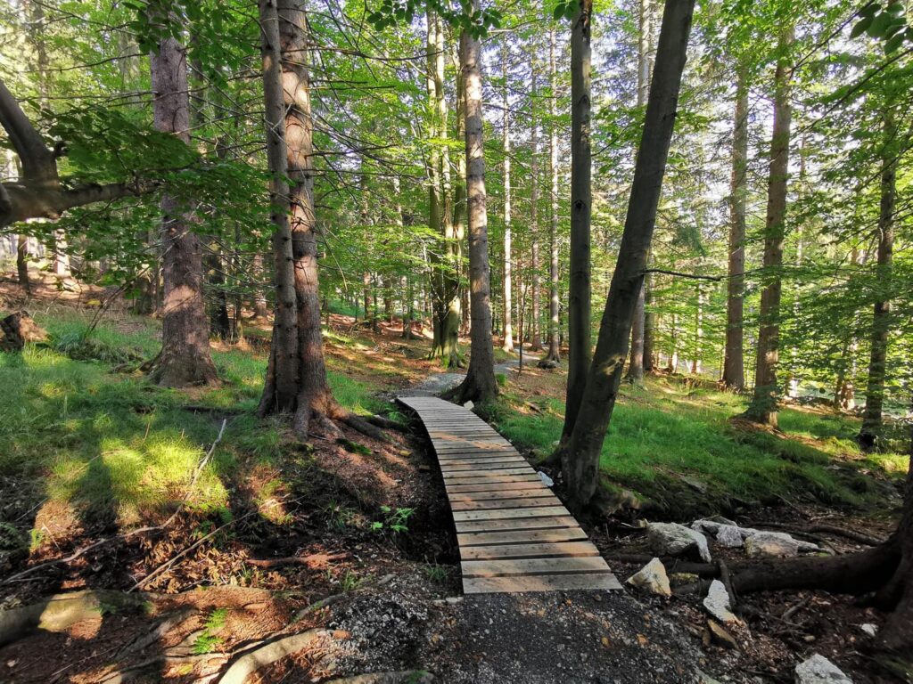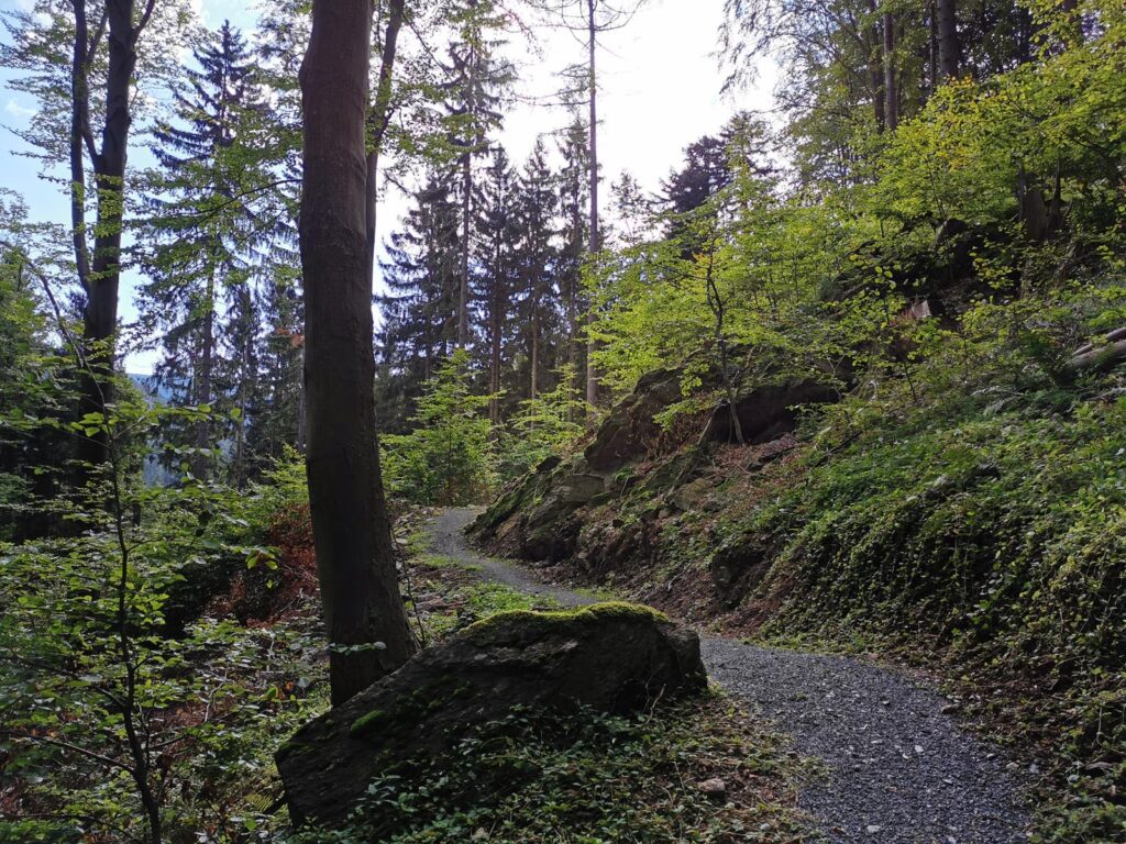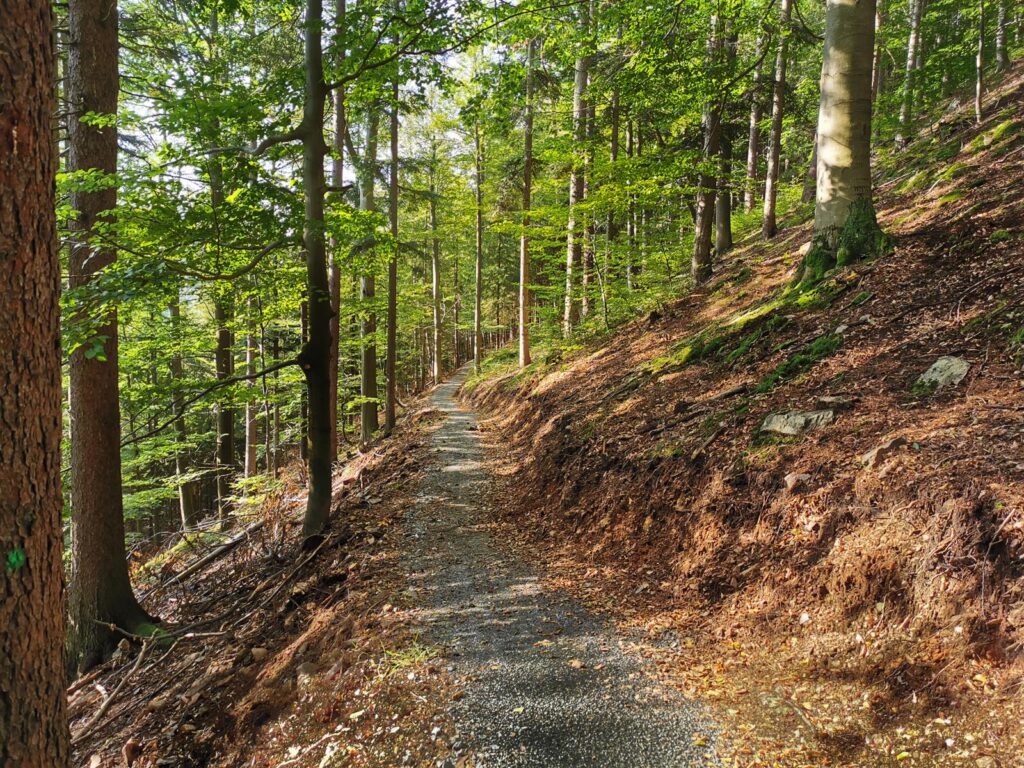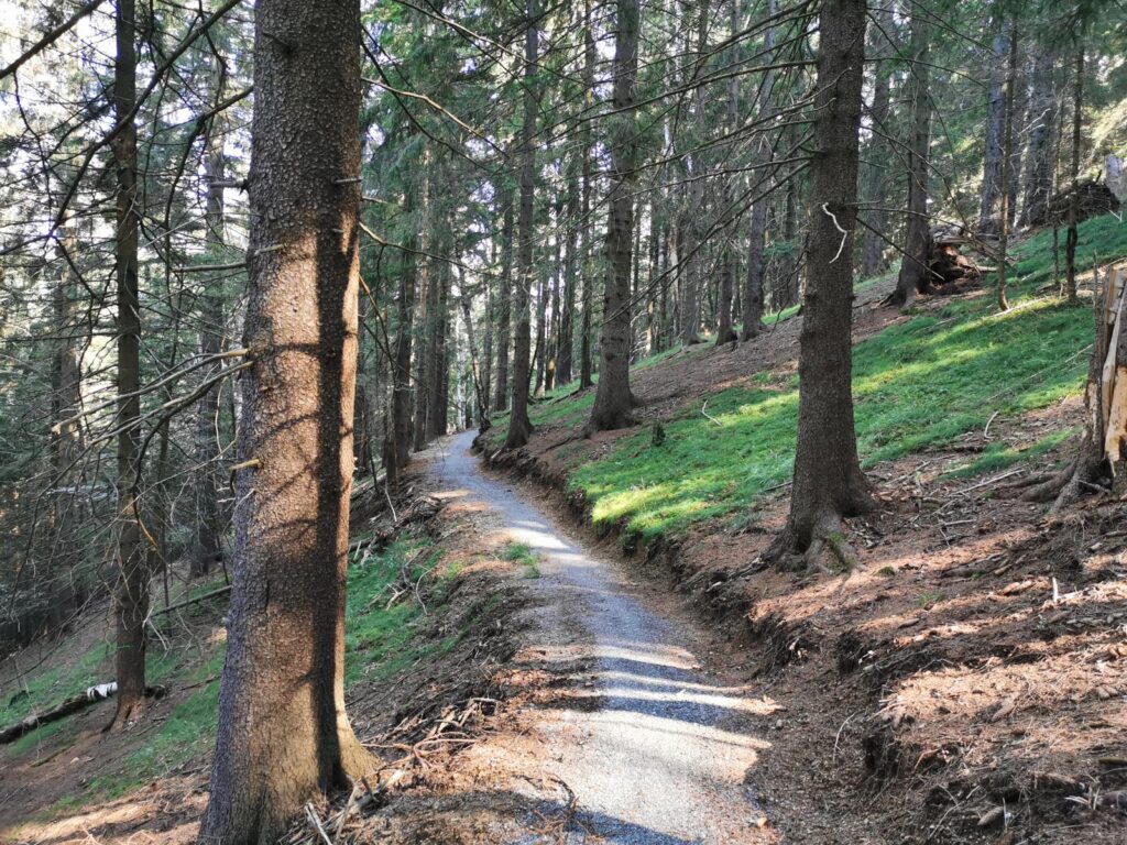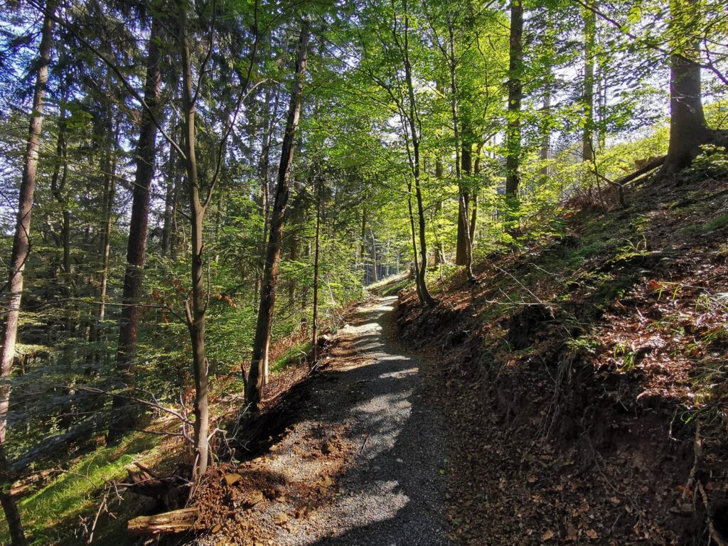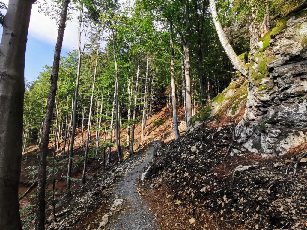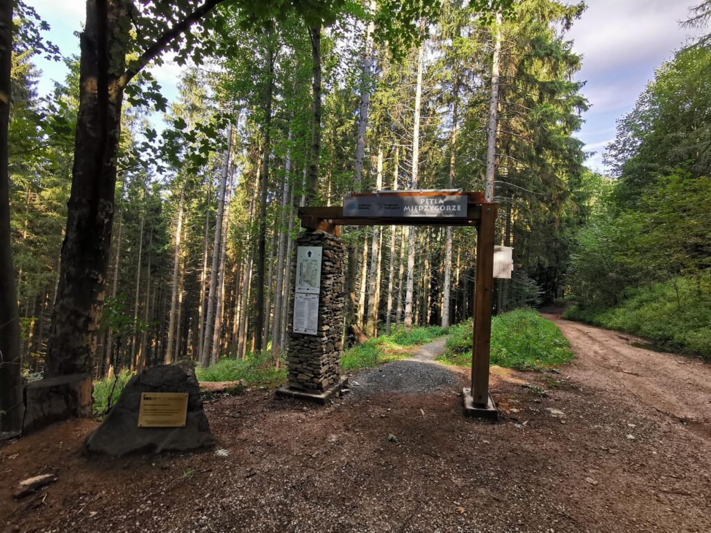 Zaczynamy dość solidnym podjazdem z miasta, bramka trasy usytuowana na końcu miejscowości. Od początku jest bardzo efektownie. Pokonujemy mocno wciętą dolinę potoku i wspinamy się stromym zboczem Góry Iglicznej. Podjazdy przeplecione są zjazdami, zasadniczo jednak pod górę. Przecinamy na końcu drogę asfaltową.