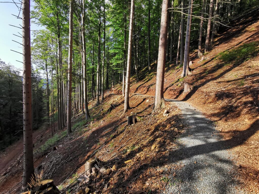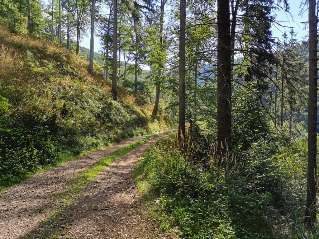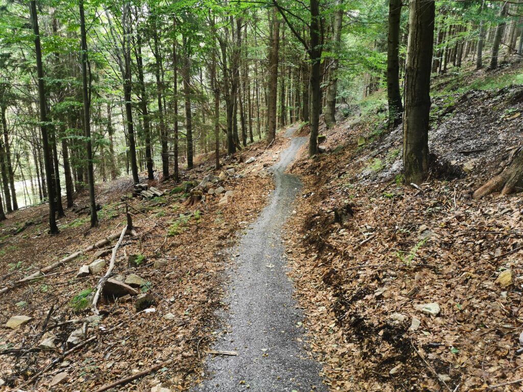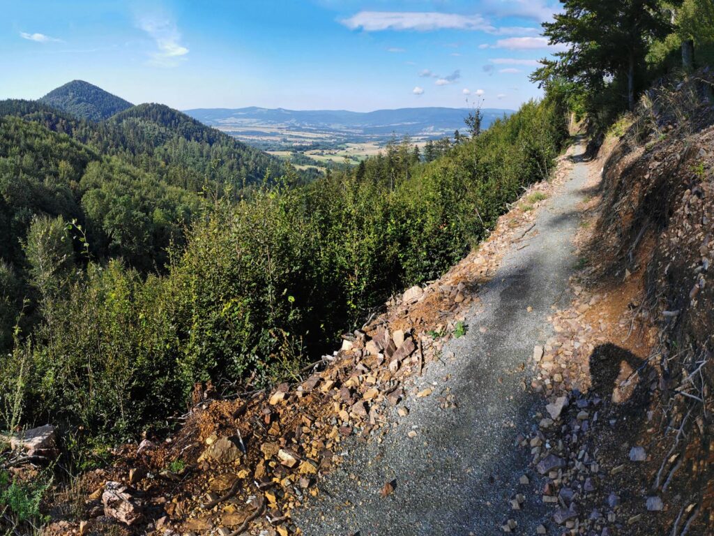 Zaczynamy spokojnym, łącznikowym, podjazdem po drogach (około 3 km). Po minięciu bramki jeszcze troszkę pod górę. Mamy tu całkiem ładny widok na Kotlinę Kłodzką z jednej strony i czarną górę z drugiej. Potem chwilę po płaskim i zjazd (już do końca pętli, około 7 km). Odcinek kończy się sekwencją ciasnych zakrętów przed doliną potoku.