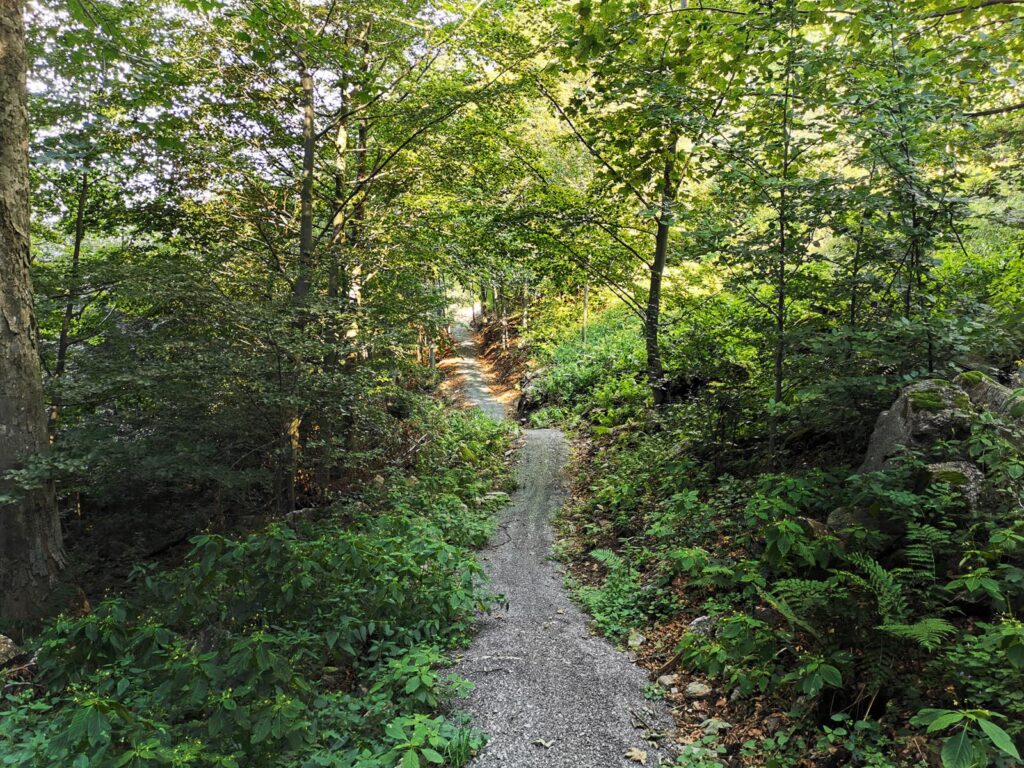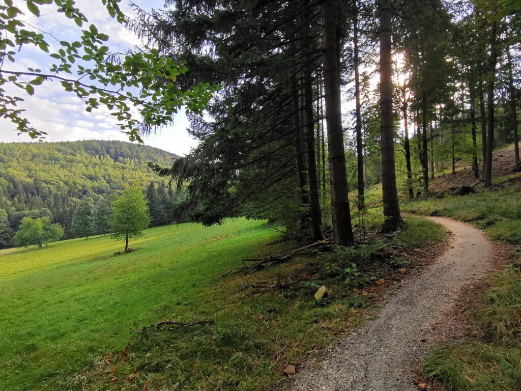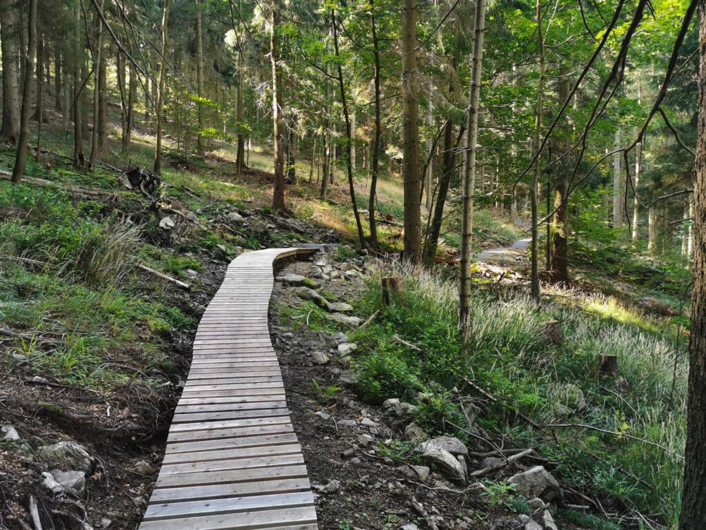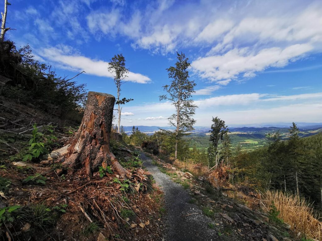 Zaczynamy spokojnym, łącznikowym, podjazdem po drogach (około 3 km). Po minięciu bramki jeszcze troszkę pod górę. Mamy tu całkiem ładny widok na Kotlinę Kłodzką z jednej strony i czarną górę z drugiej. Potem chwilę po płaskim i zjazd (już do końca pętli, około 7 km). Odcinek kończy się sekwencją ciasnych zakrętów przed doliną potoku.