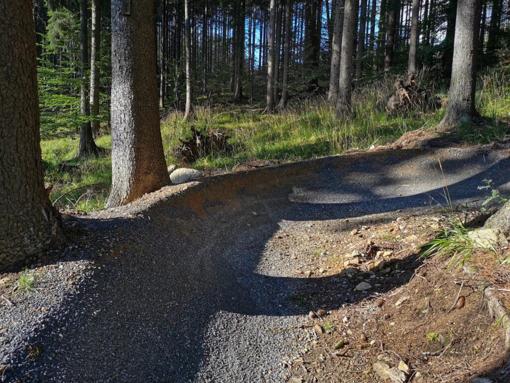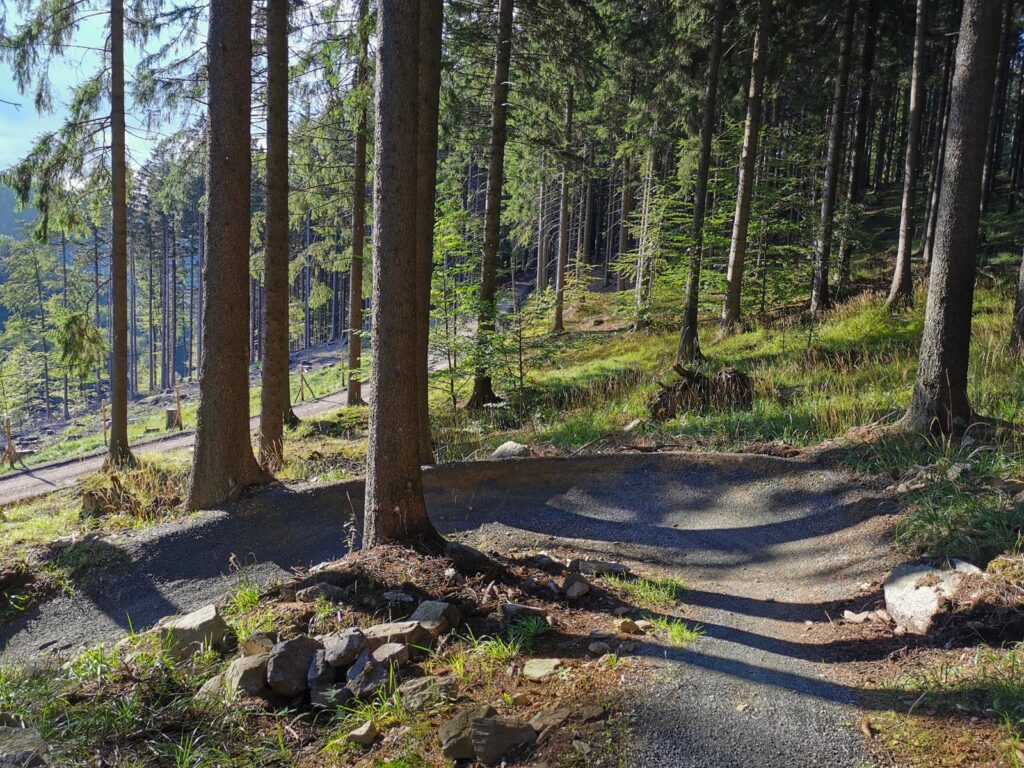 Dalszy zjazd to interesująca ścieżka, która kończy się sekwencją ciasnych zakrętów. Pętlę domykamy efektowną krajobrazową drogą wzdłuż rzeki Wilczka.