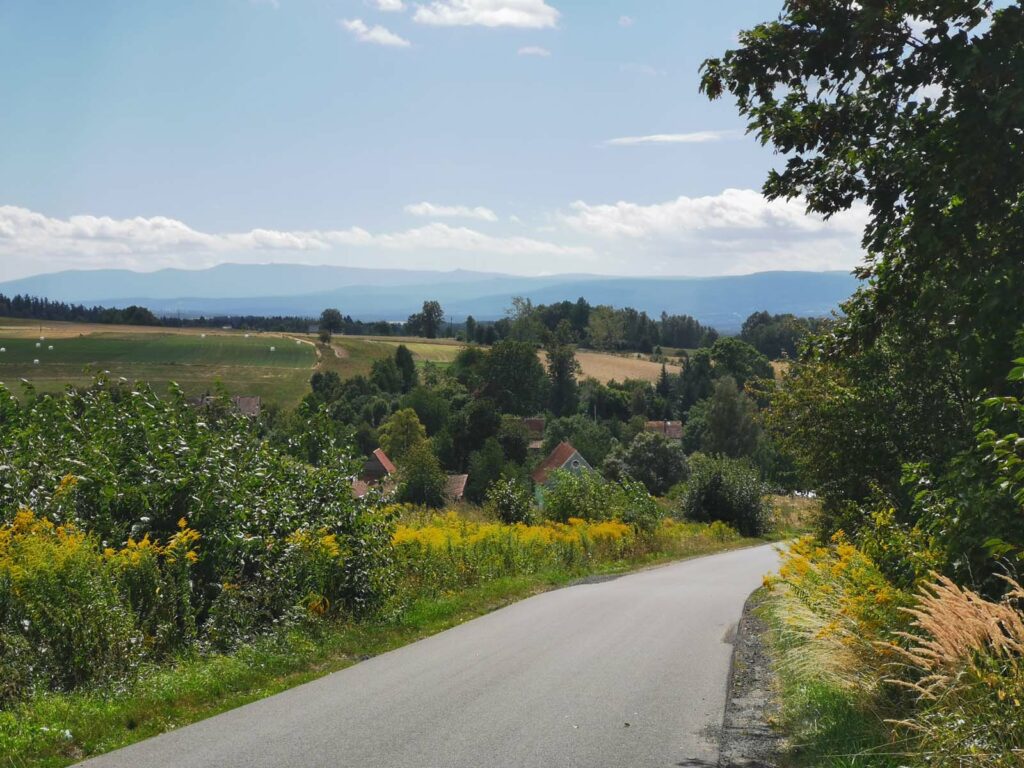 Niebieska pętla poprowadzona w większości gładkimi drogami asfaltowymi na otwartej przestrzeni. W części wschodniej (do Gradówka) o umiarkowanym, a w północnej i zachodniej, małym ruchu. Jazdę urozmaicają – w większości spokojne – zjazdy i podjazdy oraz rozległe widoki. Trasa jest dobrze oznaczona. Przy dojeździe kolejowym można zacząć jazdę na stacjach w Uboczu lub Gryfowie Śląskim. W przypadku samochodu rekomendujemy tę drugą miejscowość.