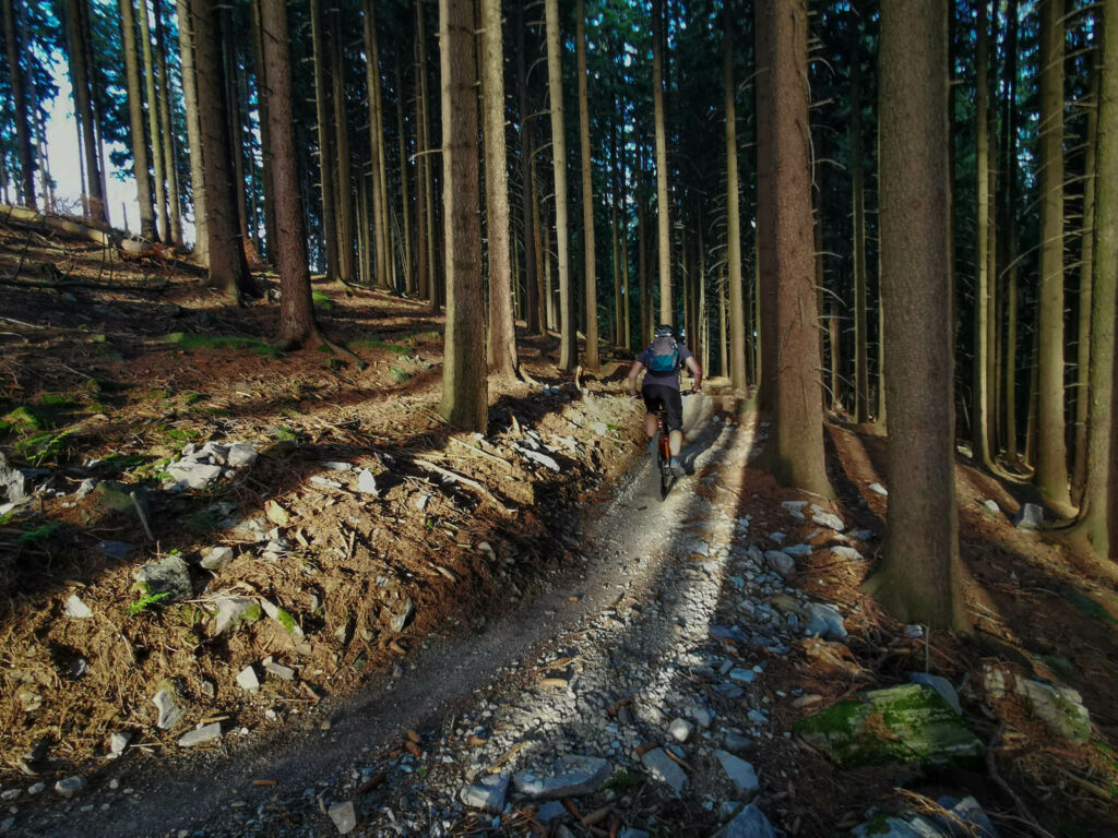 Moim zdaniem najlepszy singletrack na Pogórzu Kaczawskim. Praktycznie po drodze jest odbudowana platforma widokowa. A ponieważ dojedziemy do niej rowerem to należy potraktować ją jako punkt obowiązkowy. Sam singiel nie jest dla początkujacych, ale przy zachowaniu ostrożności i sprawnym rowerze, nie powinien nastręczyć nadmiernych kłopotów.