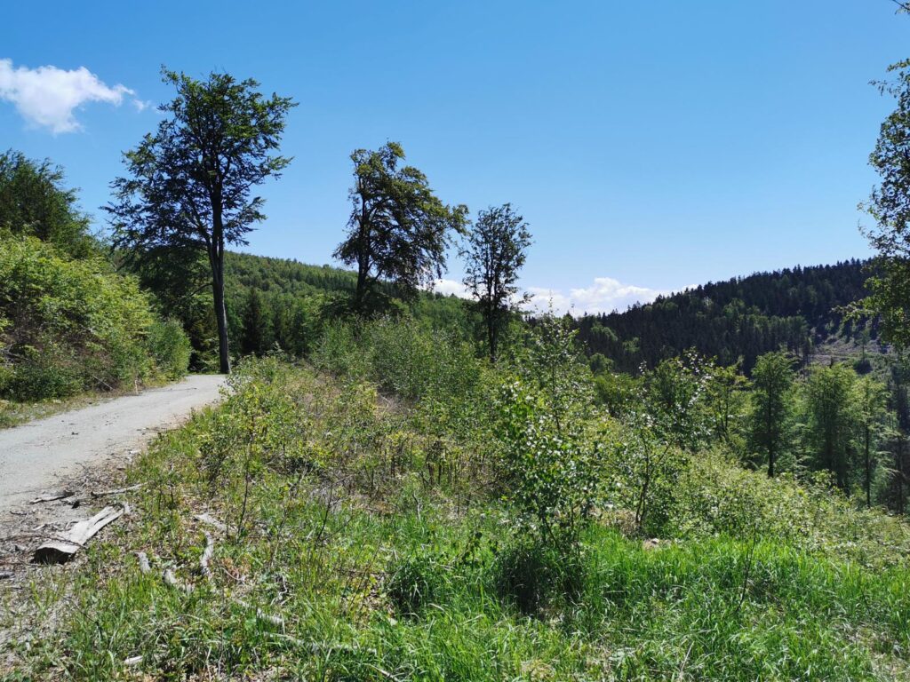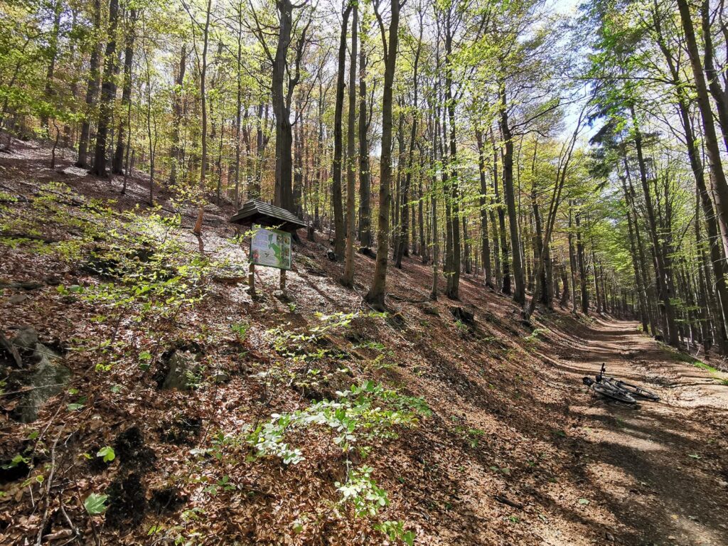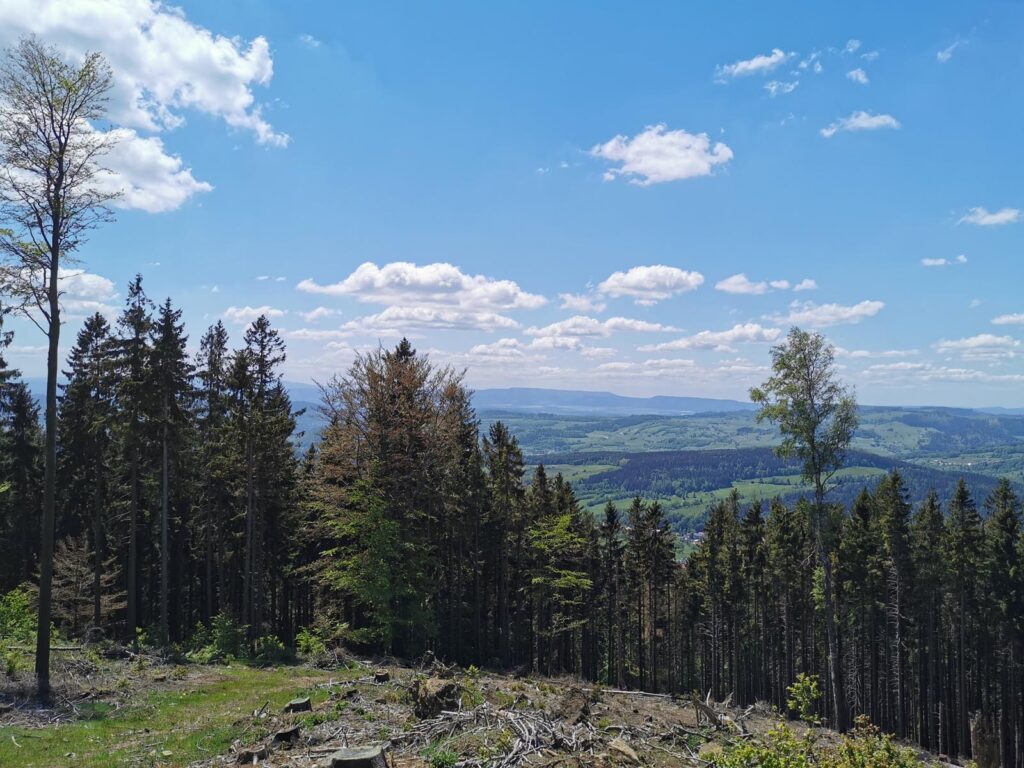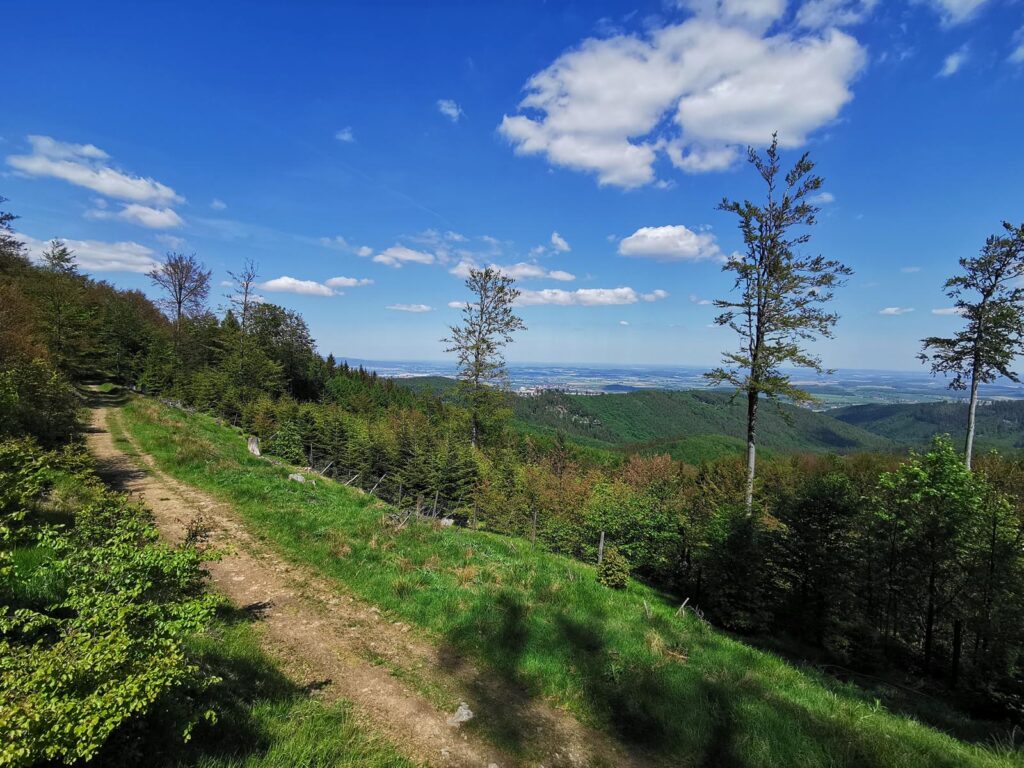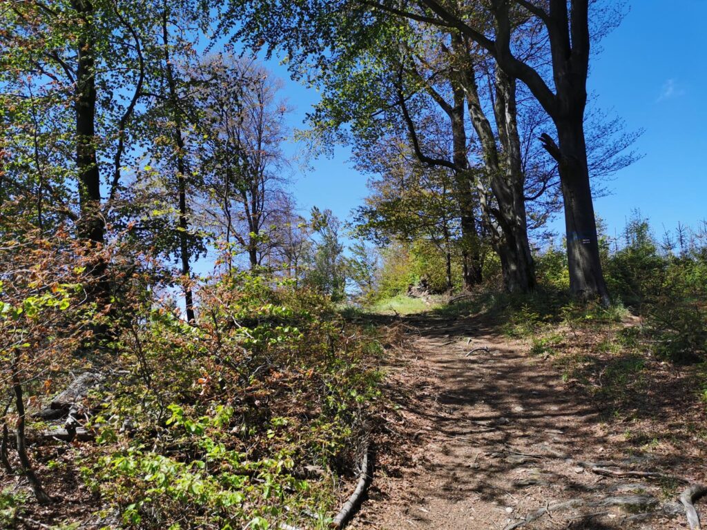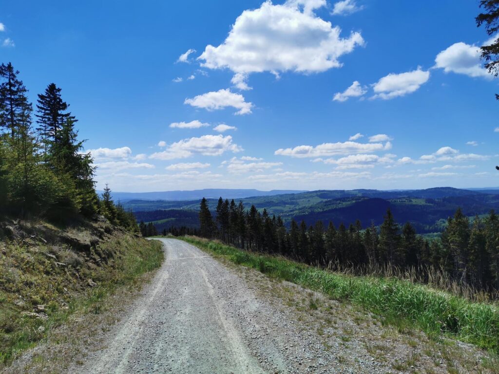 Łatwa, bardzo widokowa trasa, biegnąca głównie drogami mocno wciętymi w zbocza. Do tego jeden bardzo wymagający fragment ścieżką przez szczyt Popielaka. Opis zacznę od punktu dostępowego na przełęczy Woliborskiej i zgodnie z ruchem zegara.