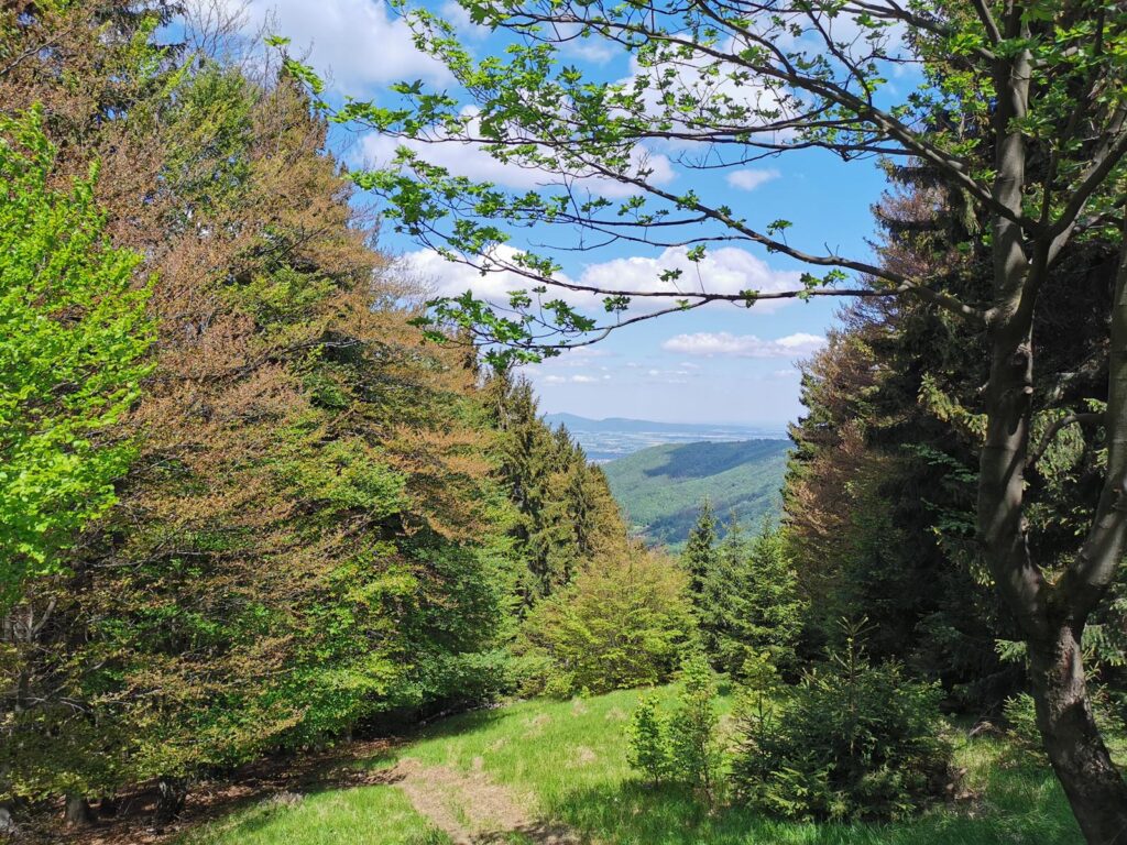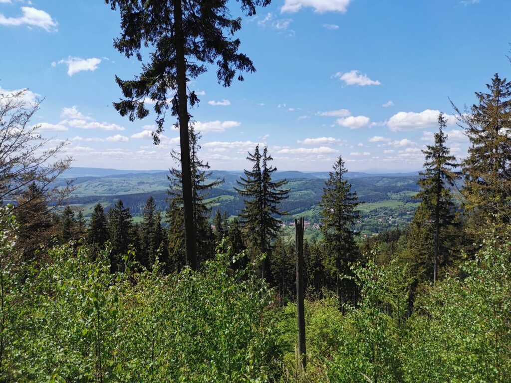 3. Przełęcz Jugowska – Polana Bielawska (północny fragment pętli). Bardzo ładny kawałek w większości schowany w lesie. Od czasu do czasu widoki. Może być mokro. Mijamy po drodze źródło Bielawicy. Przepiękny jest fragment w Rezerwacie „Bukowa Kalenica”.