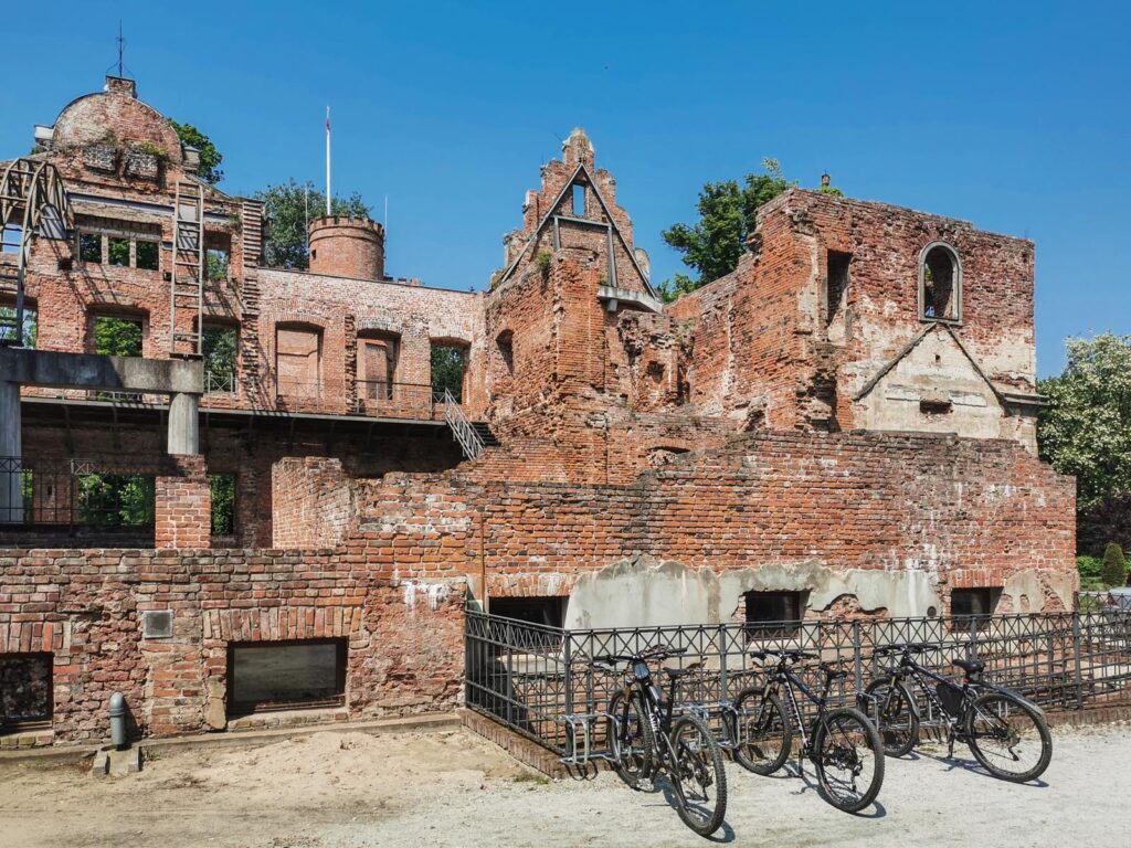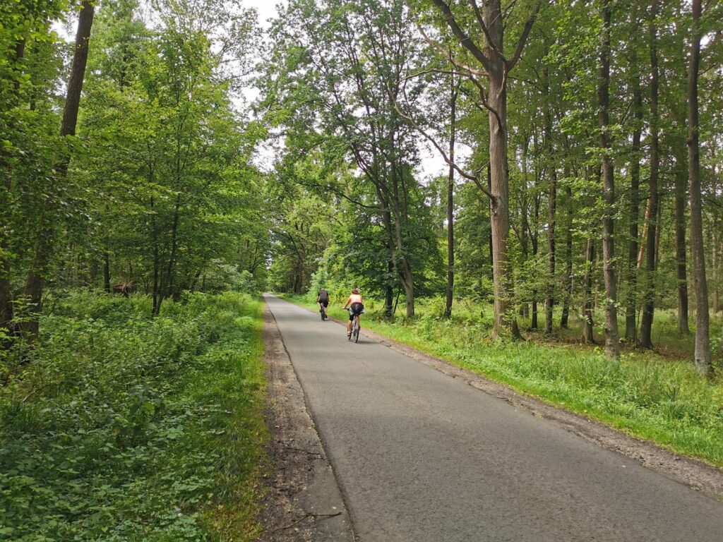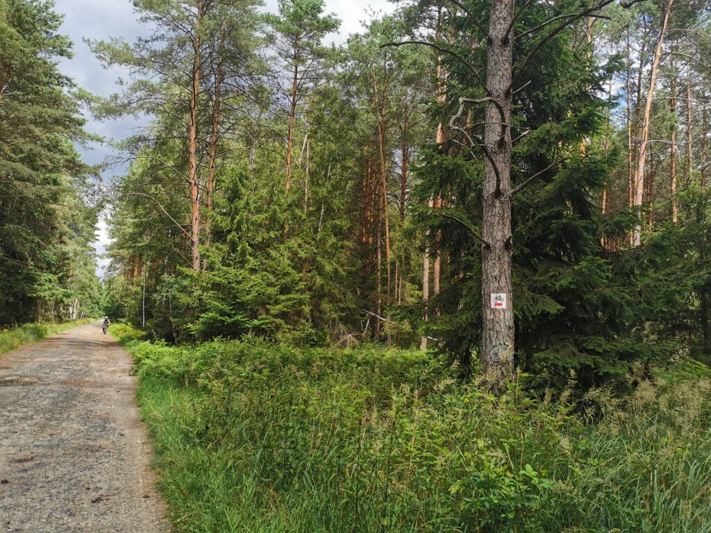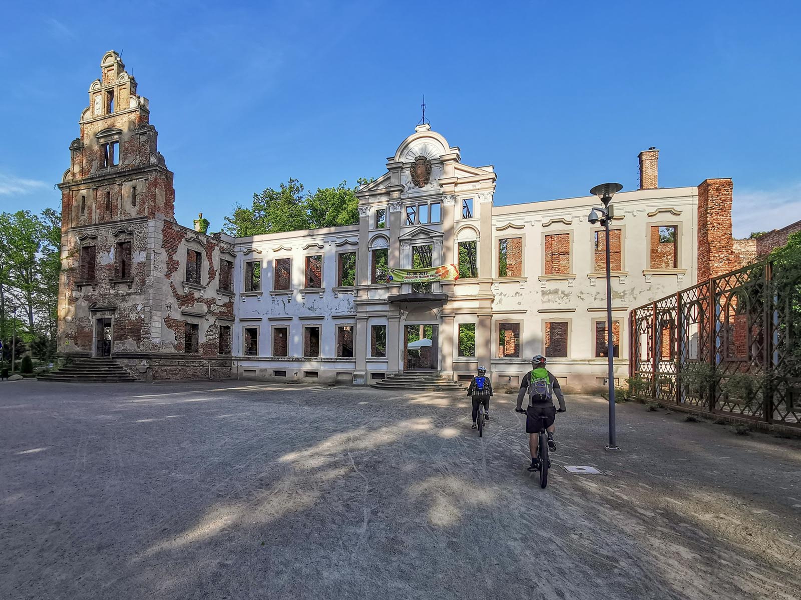 Chyba łatwiejsza część pętli – 86 km trasy (plus 3 km dojazd ze stacji). Pierwsze miejsce warte dłuższych eksploracji to zespół parkowo-pałacowy w Żmigrodzie. Pięknie utrzymany park ze stawem z wysepką (do wynajęcia), do tego mostki, altany oraz tereny i pomosty rekreacyjne warte są okolicznościowej rundki. Jeszcze ciekawsza jest, trwale zabezpieczona, pałacowa ruina, prosząca się wprost o sesję foto. Obok mamy zabytkową basztę a w jej wnętrzach Centrum Informacji Turystycznej, pokoje hotelowe i taras widokowy. Kawałek za Żmigrodem przejeżdżamy przez Tor Doświadczalny Instytutu Kolejnictwa w Węglewie, jedno z ośmiu takich miejsc na świecie. Teraz po dłuższym spokojnym przekładańcu polno-leśnym, poprowadzonym spokojnymi asfaltami, docieramy do Urazu. Tamtejszy port to punkt obowiązkowy. Polecimy zupę rybną i wędzone ryby, oraz inne atrakcje miejsca. Wracamy na asfalty, przejeżdżając obok stacji w Szewcach, aż do Strzeszowa, gdzie wjeżdżamy na wyjątkowo długi fragment idealnie prostej, gruntowej, drogi. Na zakończenie połówki pętli zaliczamy Las Malin lądując na dworcu kolejowym.