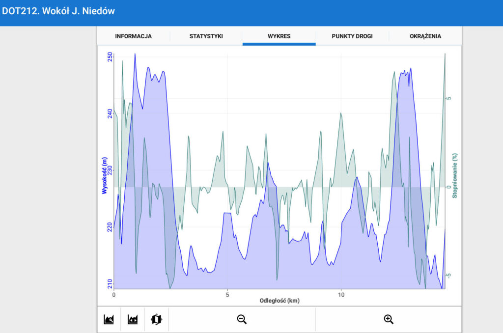 Atrakcyjna pętla wokół Jeziora Niedów poprowadzona po praktycznie pustych drogach asfaltowych oraz odcinkach dedykowanych dróg rowerowych. 170 m przewyższenia przy 14 km wskazuje na jej „podgórski” charakter. Podjazdy, podchodzące pod 8%, są dwa. Trasa jest interesująca i ma dobre walory widokowe.