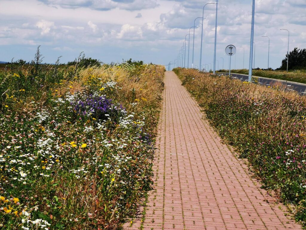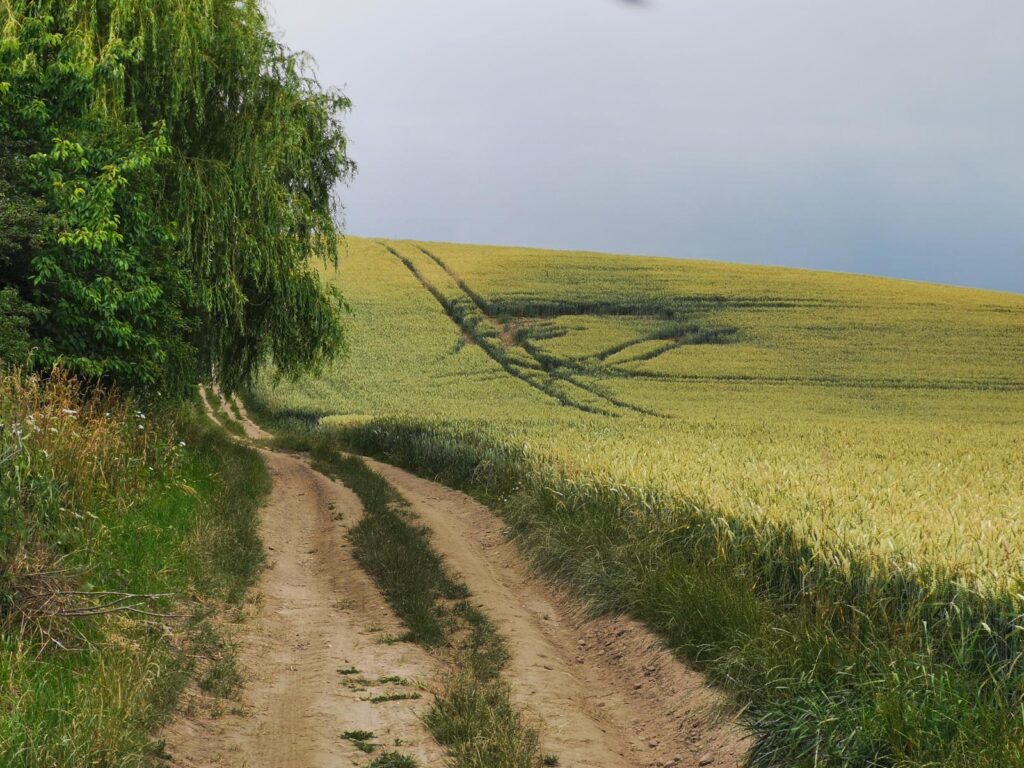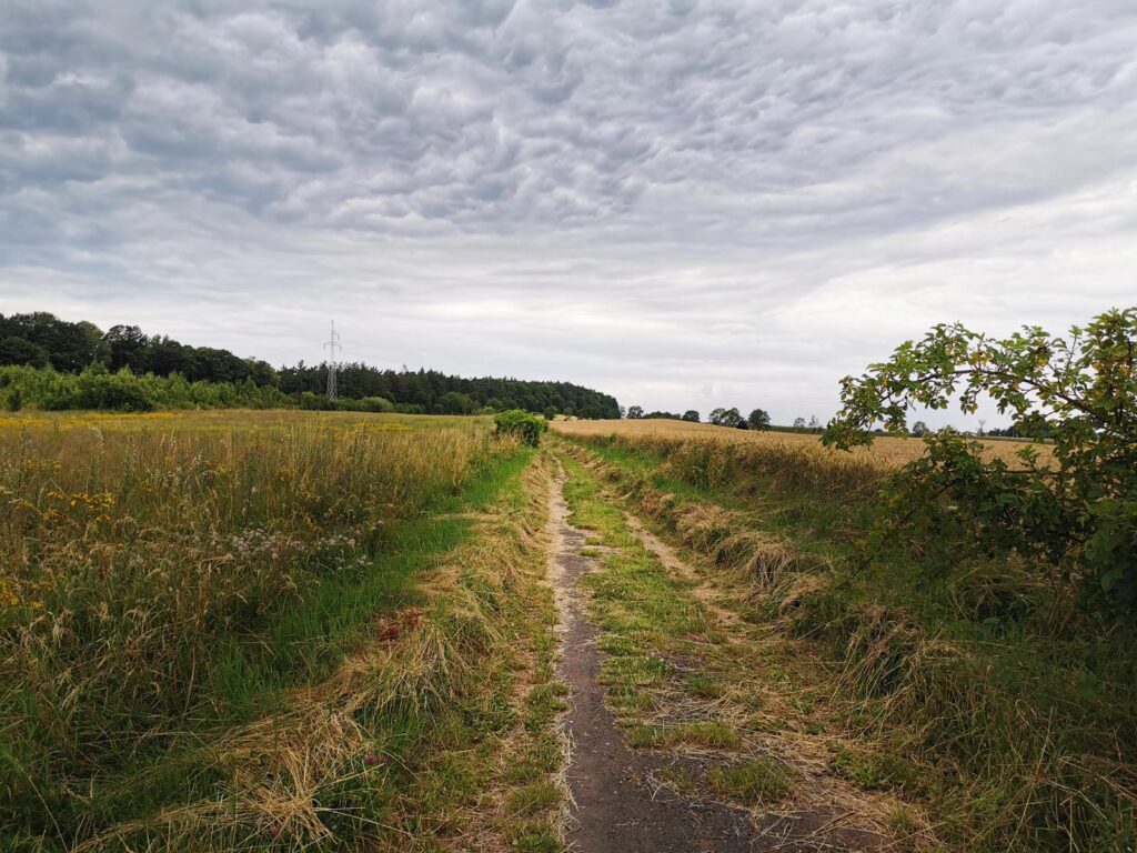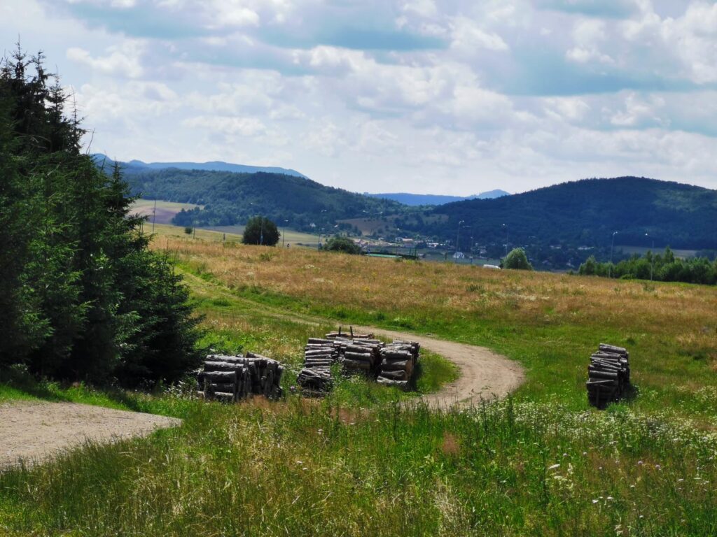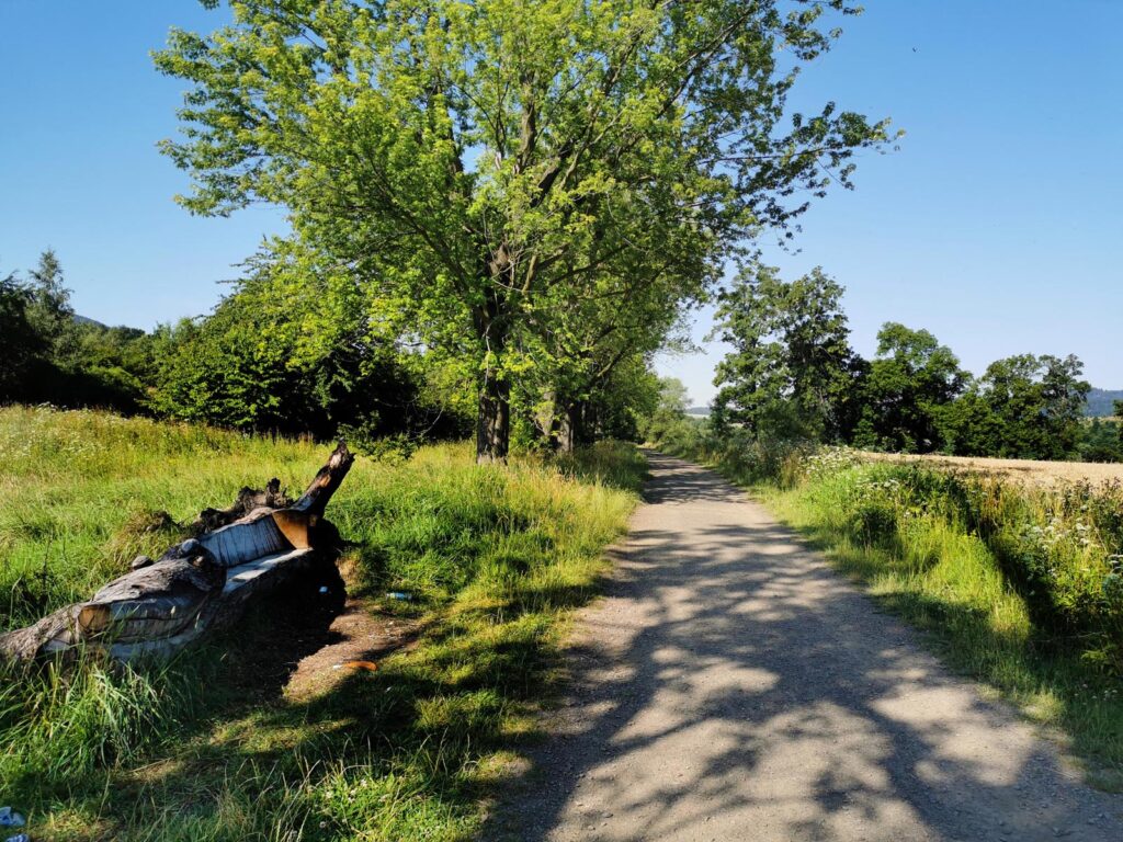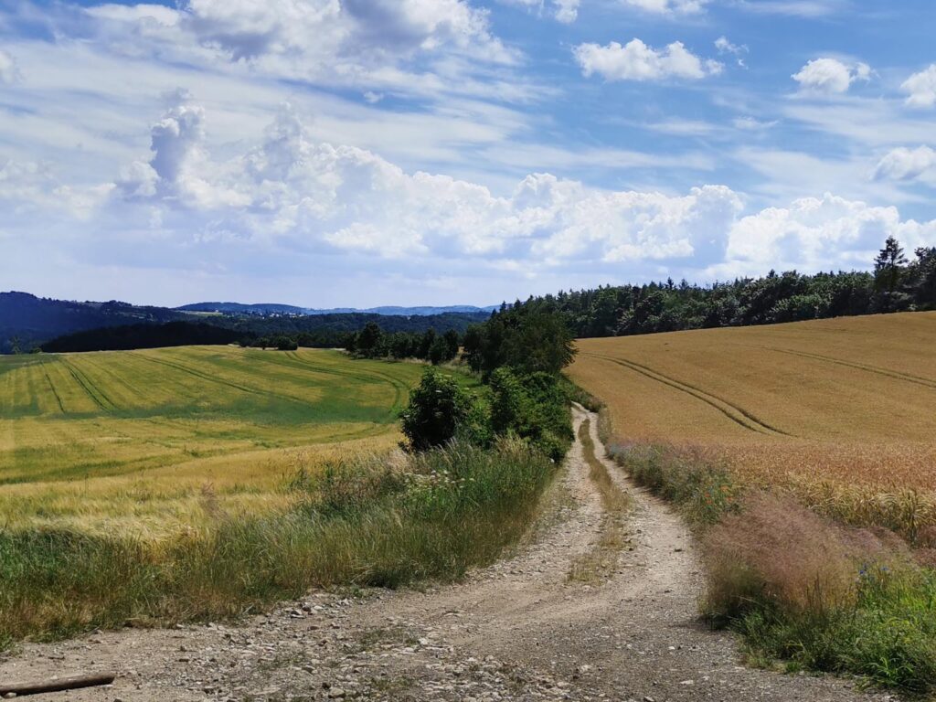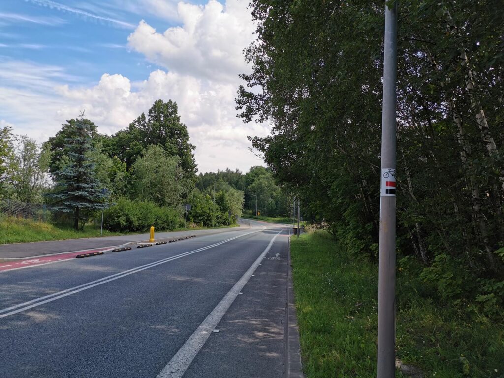 Bardzo zmienny w charakterze odcinek. Czeka nas ciągła huśtawka wysokościowa: podjazd-zjazd, ale spady litościwe bo zasadniczo w zakresie 5%. Jedziemy się przez niewielkie wysepki lasów i rozległe pola z wspaniałymi widokami. są też zurbanizowane tereny podmiejskie. Szczególnie efektowny jest fragment za Podzamczem, z widokiem na Trój-garb i Chełmiec. Uwaga: przy strefie ekonomicznej, za Mando, ze ścieżki rowerowej trzeba wjechać na ruchliwą 379 (i nią około 600 m) bo tylko tak można dostać się17:51 2020-09-24 wygodnie na dalszą część trasy. Jak się zagapimy to na wyjeździe przed Toyotą po zjechaniu na pobocze trzeba będzie poprowadzić rower „do tyłu” ze 100 m.